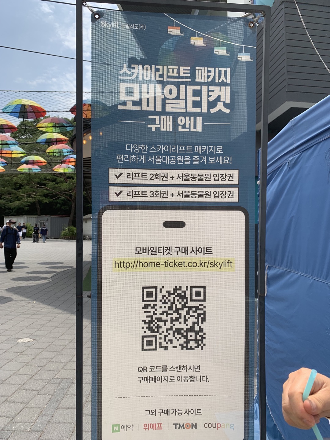 아래는 스카이 리프트 패키지 모바일  티켓 구매 사이트로 바로 연결되는 과천 서울대공원 현장에 있었던 QR을 공유 드립니다. 그 외에 위메프, 티몬과 같은 사이트에서도 구매할 수 있다고 나와 있습니다.