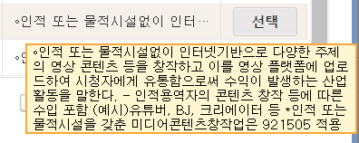 대표적으로 유튜버, BJ, 크리에이터가 있습니다. 이 업종은 인적 또는 물적 시설 없이 인터넷 기반으로 다양한 주제에 영상 콘텐츠를 제작 창작하고, 이를 영상 플랫폼에 업로드하여, 시청자에게 유통함으로써 수익의 발생하는 산업 활동을 말합니다. 컨텐츠 창작 등에 따른 수입도 포함됩니다.